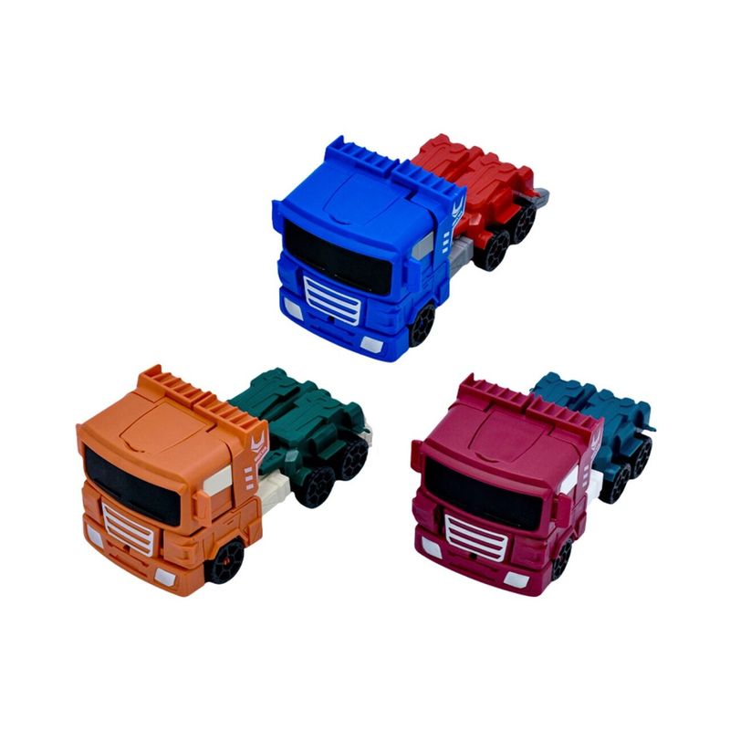 Set de 3 figuras transformables que alternan entre robot y vehículo para triplicar la diversión. Con articulaciones y diseño resistente, promueven el juego de rol, la creatividad y el desarrollo de habilidades motoras. Ideal para compartir entre hermanos o ampliar la colección con múltiples combinaciones.