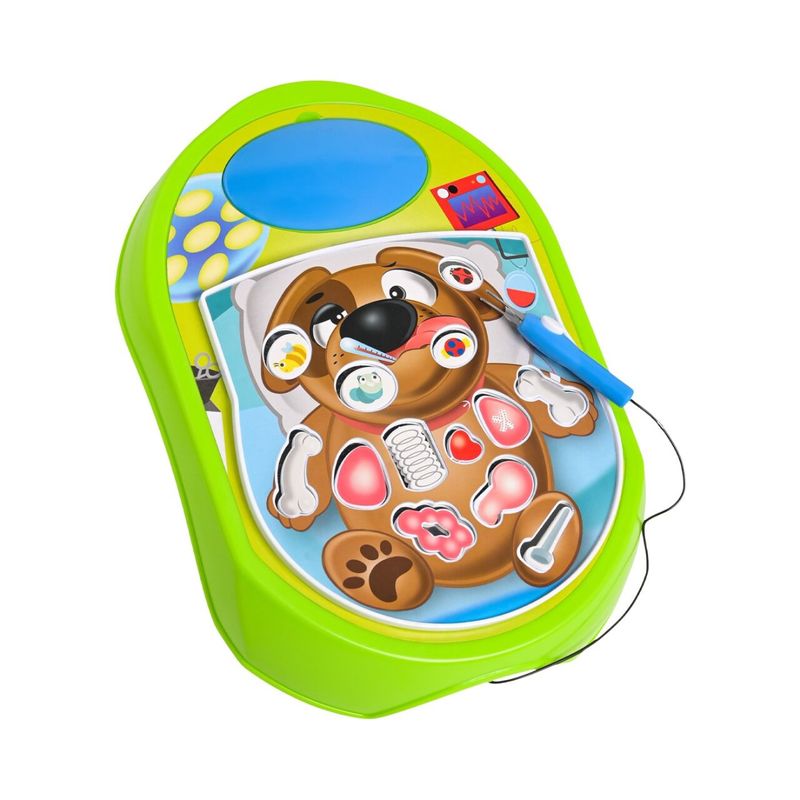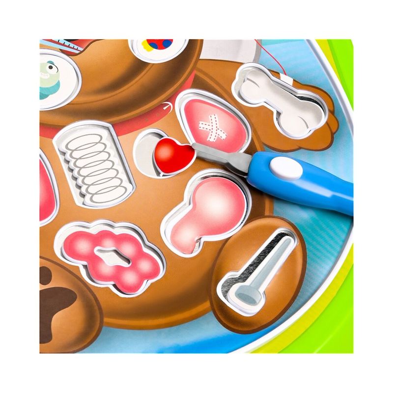 Juego de precision tipo operacion con tablero en forma de perrito. Usa la pinza para extraer piezas sin tocar los bordes. Desarrolla pulso, coordinacion y toma de decisiones. Requiere 2 baterias AA no incluidas.
