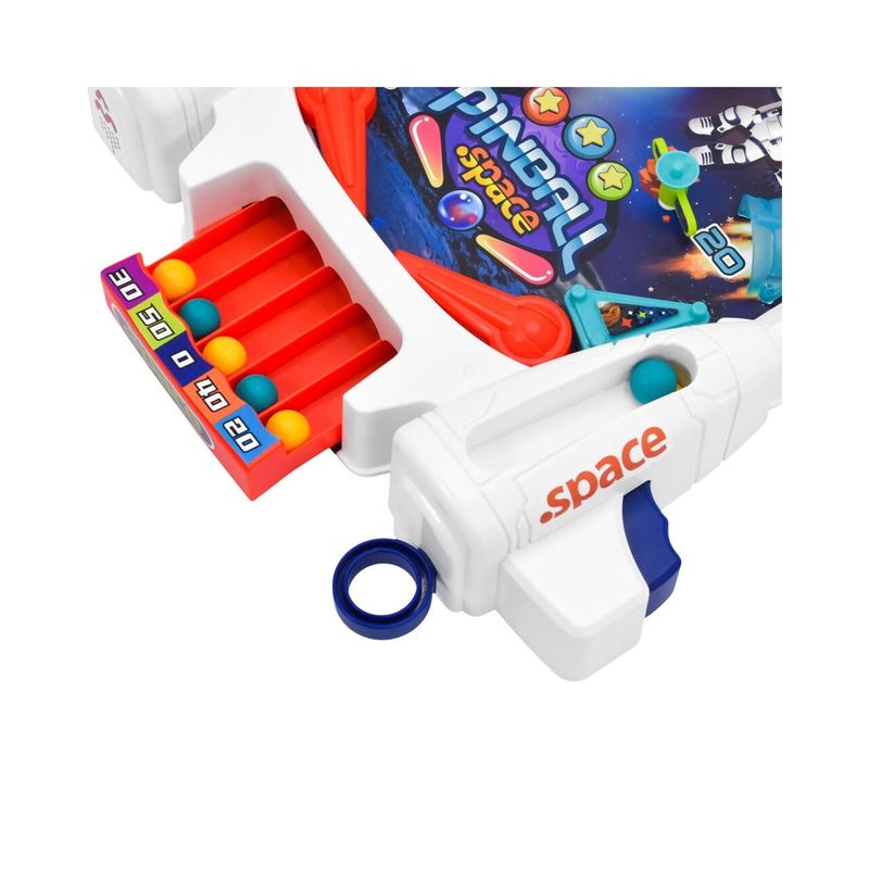 Pinball de mesa con tematica espacial, lanzador, palancas y obstaculos para mantener la bola en juego. Estimula reflejos, tiempo de reaccion y coordinacion, con accesorios que ambientan cada partida.