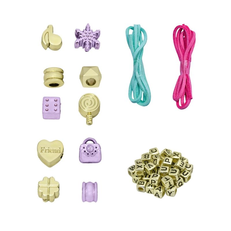 Con el Set de Pulseras y Collares Fancy Girl las niñas pueden formar nombres o mensajes con dijes de letras y accesorios decorativos. Incluye cordones satinados y piezas para crear joyas únicas. Estimula la creatividad, la motricidad fina y la expresión personal mientras disfrutan de una actividad divertida para compartir.